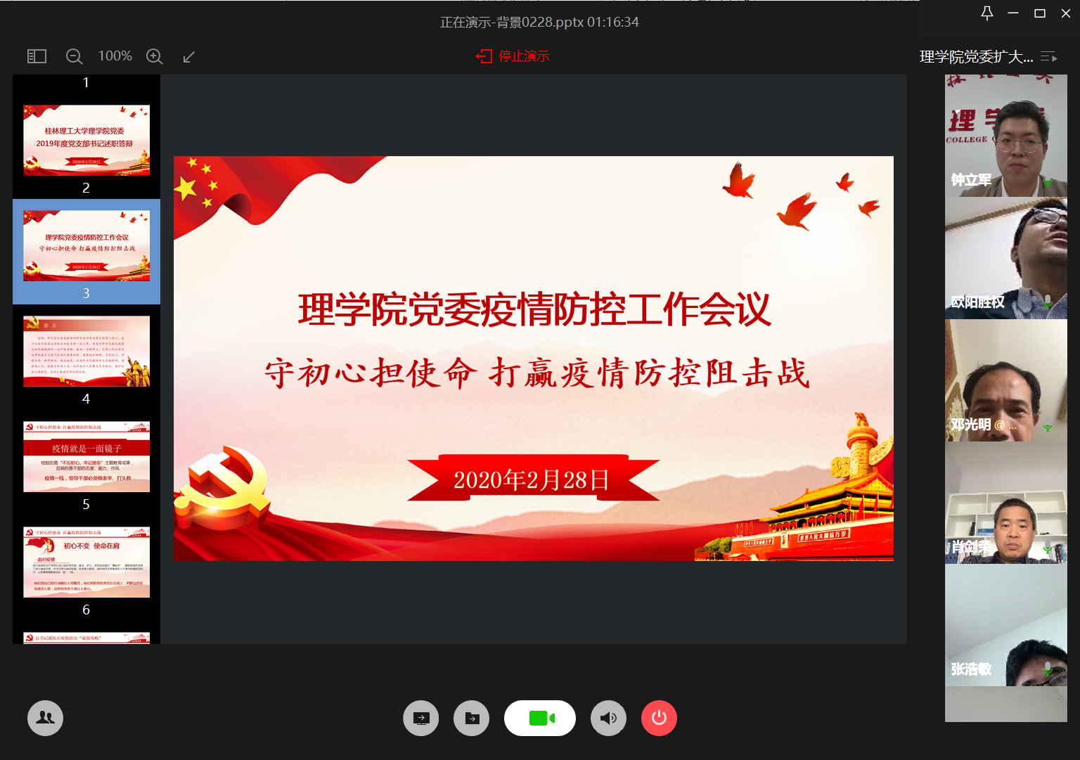 接着欧阳书记向在场的同志从“落实主体责任方面”、“疫情防控方面”、“党员干部担当作为方面”介绍学院截止目前关于疫情防控工作落实的相关情况,同时在做好三方面的基础上对学院的工作特色和亮点做了重点补充。随后他对做好下一阶段的疫情防控工作提出五点要求:一要提升政治站位,增强“四个意识”、坚定“四个自信”,坚决做到“两个维护”,要深入贯彻习近平总书记重要指示精神和党中央、国务院决策部署;二要认清严峻形势,在特殊时期,为学生尽力,为学校分忧,以高度的责任感和使命感投入到疫情防控工作中来,不能有丝毫松懈情绪、不能有丝毫侥幸心理、不能有丝毫马虎大意;三要落实制度,分类把控与管理,坚持做好“日报告”“零报告”;四是要继续在工作中提升,创新形式的做好群团工作,挖掘典型事迹,有好的方以文化作品创作;五要做好跟踪摸排,切实掌握学校未上班教职员工外出活动信息,要切实掌握学生在家活动信息,不间断的做好跟踪统计工作。
