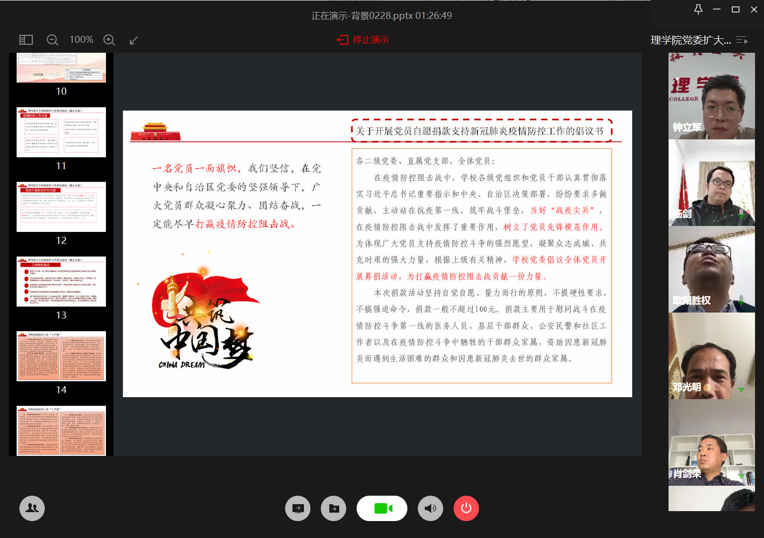 最后党委副书记钟立军带领学习了《学校疫情防控工作“十严格”》的相关内容和要求,通报了疫情期间因违纪处理的案例,以案明纪,并对学校开展党员自愿捐款支持新冠肺炎疫情防控工作做了倡议。
