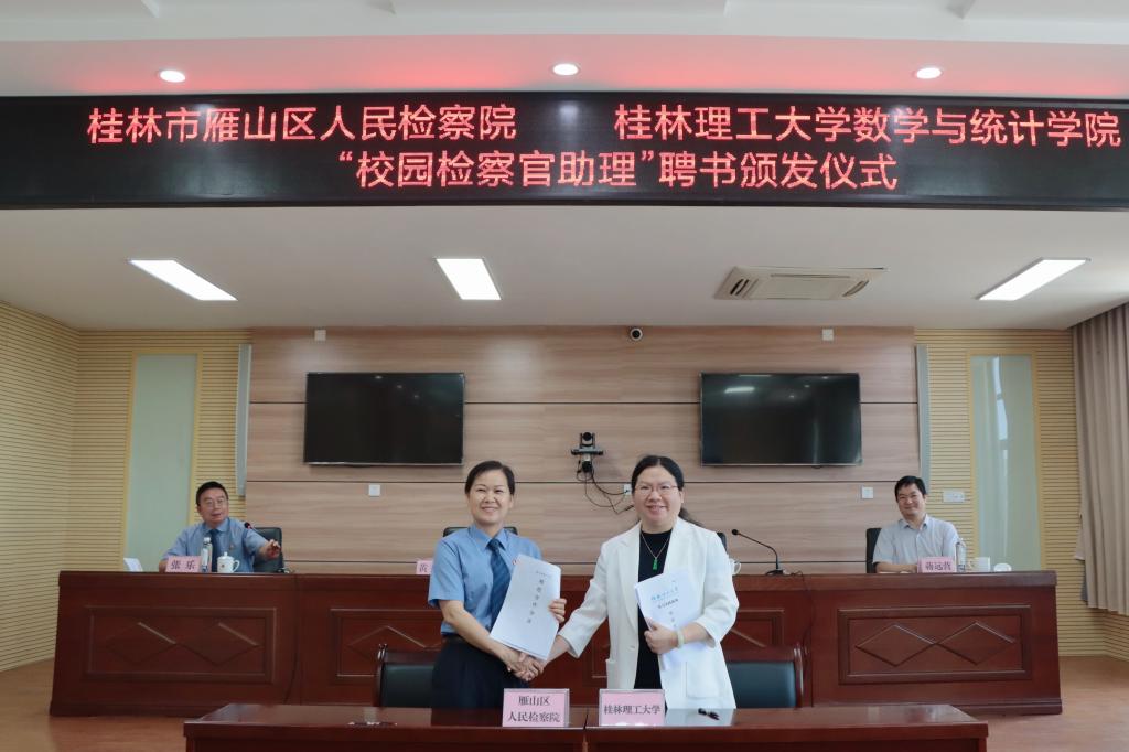 学院党委书记江玲与雁山区人民检察院党组书记、检察长黄干莲代表校检双方签订合作共建《协议书》
