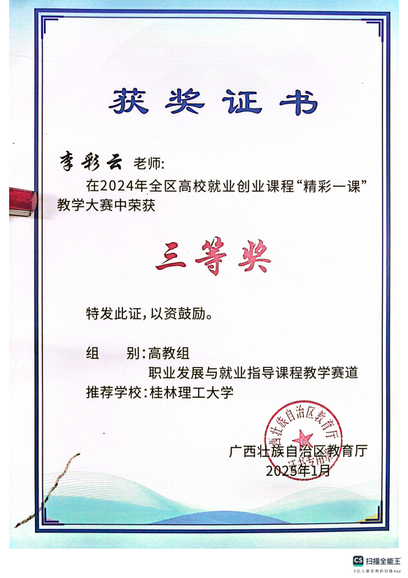 此外,夏晴老师获评2023-2025年度学校优秀共产党员、李艮老师获评学校2025年就业工作先进个人、彭娇娇老师获评全国100支志愿宣讲团“优秀团队”指导老师、李彩云老师获评中国国际大学生创新大赛(2025)“建行杯”广西赛区选拔赛高教主赛道银奖指导老师等涵盖心理健康教育教学、创新创业、就业工作、职业规划等多个方面累计获得各类荣誉奖项30余项。值得一提的是,学院成功获批教育部供需对接就业育人项目3项,充分展现了学院辅导员队伍过硬的专业素养和良好的精神风貌。