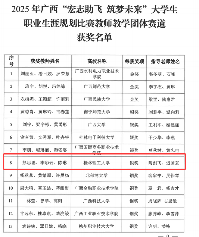 个人层面,辅导员们立足岗位深耕细作,凭借过硬业务能力屡创佳绩:在2025年广西“宏志助飞”大学生职业生涯规划比赛和就业创业课程“精彩一课”教学大赛中,李彩云老师脱颖而出,分别荣获区级银奖和区级三等奖;在桂林理工大学第三届党务工作者基本功大赛中,夏晴老师斩获一等奖;在学校第十四届辅导员素质能力大赛中,夏晴、彭娇娇、李彩云三位老师分别荣获特等奖、一等奖、三等奖及最佳表现奖,学院参赛人数与获奖人数均位居全校前列;在学校心理健康教育课教师教学能力比赛中,彭娇娇与李彩云两位老师斩获二等奖。