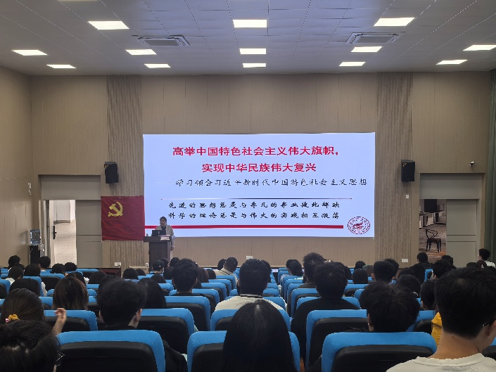江玲书记以《高举中国特色社会主义伟大旗帜,实现中华民族伟大复兴——学习领会习近平新时代中国特色社会主义思想》为主题,围绕“中国特色社会主义进入新时代”“当今世界经历新变局”“中华民族伟大复兴面临新考验”“科学社会主义焕发新生机”四个维度,系统阐释了习近平新时代中国特色社会主义思想形成的时代背景、历史逻辑与实践基础。她强调,先进的思想与非凡的事业相互辉映,科学的理论与伟大的实践彼此激荡,新时代党员发展对象要深刻理解党的创新理论,增强“四个意识”、坚定“四个自信”、做到“两个维护”。