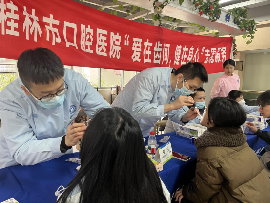 随后,在服务大厅内,来自桂林市口腔医院的专家团队忙碌而有序地为学校师生提供免费检查。