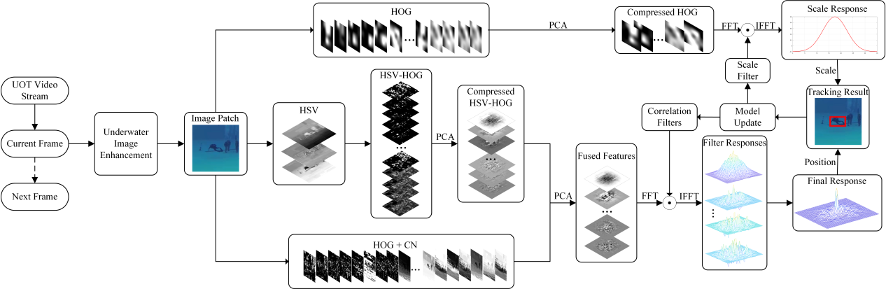 论文基于相关滤波框架,结合图像增强算法和两阶段的特征压缩机制,提出了一种面向水下环境的视觉目标跟踪方法。与现有方法相比较,所提方法能够更好地应对水下环境的图像偏色、低可见度、复杂背景干扰等挑战因素,且在两个公开的水下物体跟踪数据集上展现了良好的跟踪效果(论文链接:https://link.springer.com/article/10.1007/s40747-024-01755-y)。
