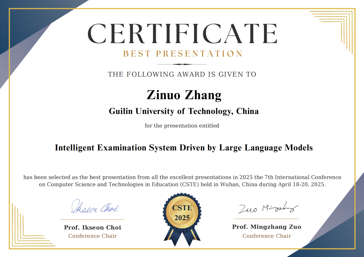 williamhill体育入口注册信息与计算科学专业本科生张子诺同学线上参加了本次会议,用英文汇报了其作为第一作者投稿的论文《Intelligent Examination System Driven by Large Language Models》,探讨了大模型技术在智能化考试系统中的应用,并得到了会务组专家和参会同行们的普遍认可,最终斩获最佳报告奖(Best Presentation Award)!该论文由信科教研室林彬副教授(本文通讯作者)、谢海副教授和封全喜教授共同指导,信科专业2022级本科生张子诺、陈道彬、黎晋铭及信科专业2024届毕业生杨鹏共同撰写而成,已收录在本次会议论文集,近期将被提交至EI数据库检索,对应的原型系统已于2025年1月获得软件著作权。