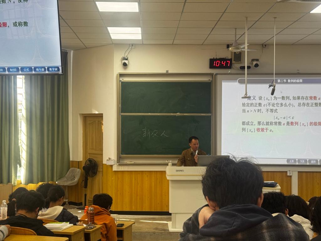 课堂上,黄加炳老师紧扣教学目标,以“数列的极限”为核心展开教学。他教学逻辑严谨、重点明确,对知识难点讲解透彻、通俗易懂,尽显扎实的专业素养与教学能力。黄老师巧妙运用数字化教学手段,借助“学习通”平台实现课堂签到、互动答疑、随堂练习布置等功能,极大提升了课堂流程的规范性与效率。同时,他融入课程思政元素,以中国古代数学家刘徽的“割圆术”为例,生动呈现极限思想的数学渊源,实现知识传授与价值引领的有机统一,赢得听课教师高度认可。